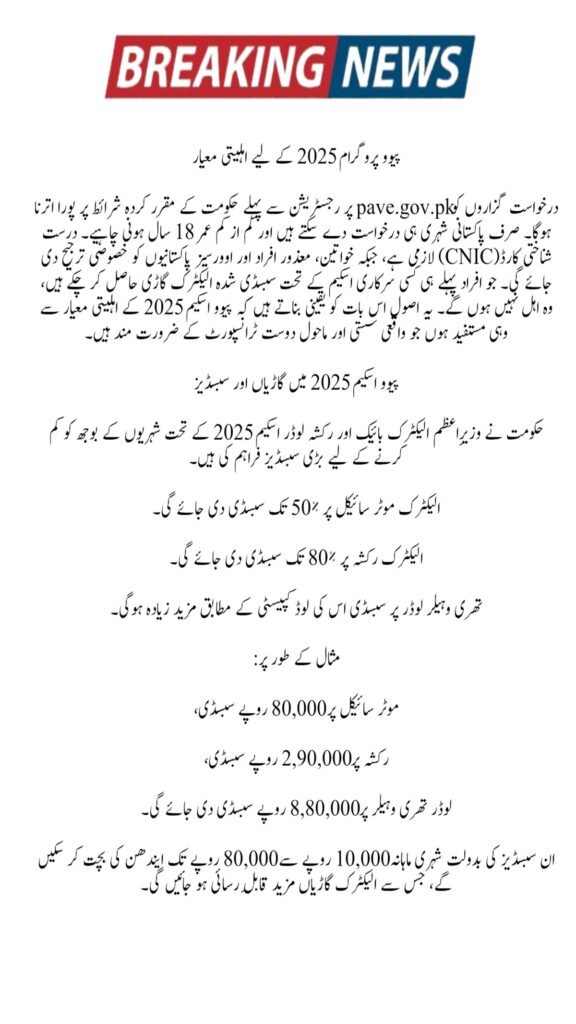 In this article, we are sharing all the details about the Pakistan Accelerated Vehicle Electrification Program (PAVE) 2025–30. This initiative under the PM Electric Bike and Rickshaw Loader Scheme 2025 aims to promote eco-friendly electric vehicles in Pakistan and reduce fuel dependency. Citizens can apply on pave.gov.pk to get motorcycles, rickshaws, and three-wheelers on subsidies and easy installments. With special quotas for women, disabled individuals, and overseas Pakistanis, the scheme ensures affordability for all. The first phase of the program will distribute thousands of vehicles between 2025–26.