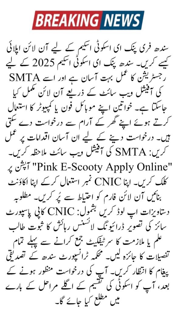 The Government of Sindh has launched the Sindh Free Pink E-Scooty Scheme 2025 to help female students and working women travel easily and safely. This project is managed by the Sindh Mass Transit Authority (SMTA) and focuses on providing free pink electric scooters to women across the province. The scheme is a major step toward empowering women by improving their access to education and jobs. It also supports eco-friendly travel by promoting electric vehicles that produce no pollution and save energy. The scooters are stylish, comfortable, and safe for everyday use.