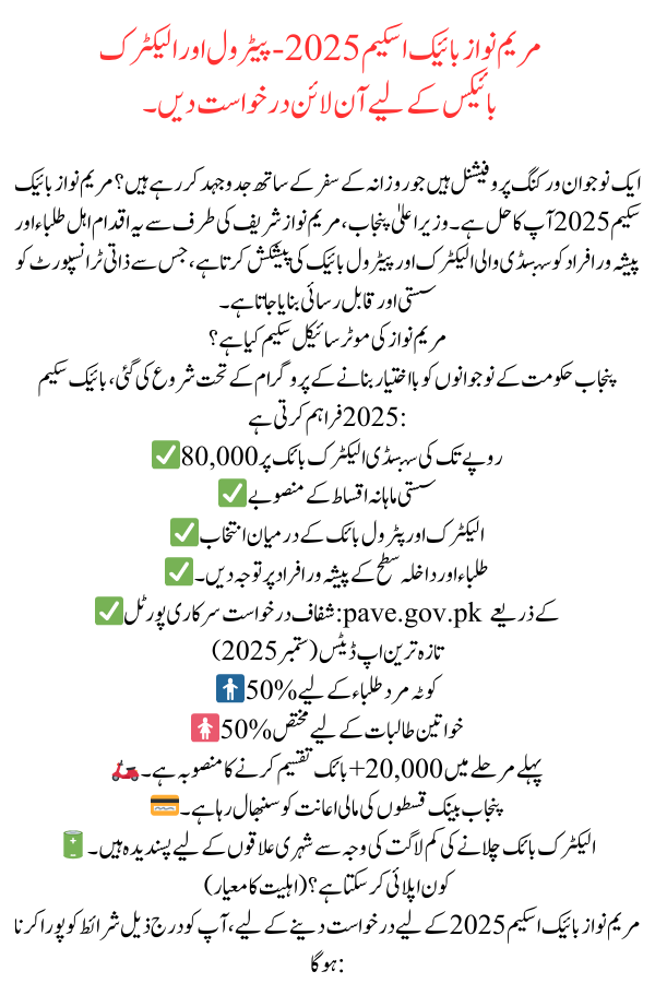 Latest News: Maryam Nawaz Bike Scheme Apply Online for Petrol Electric Bikes (Update 2025)