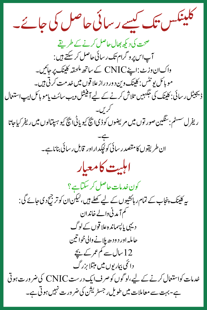 | Method of Access / Application | Walk-in with CNIC / mobile clinics / digital tracking / referrals |