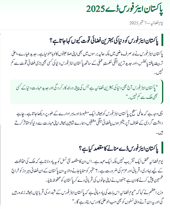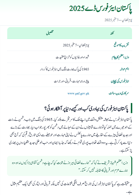 | Occasion | PM Shehbaz pays tribute to Pakistan Air Force Day – September 7, 2025 |