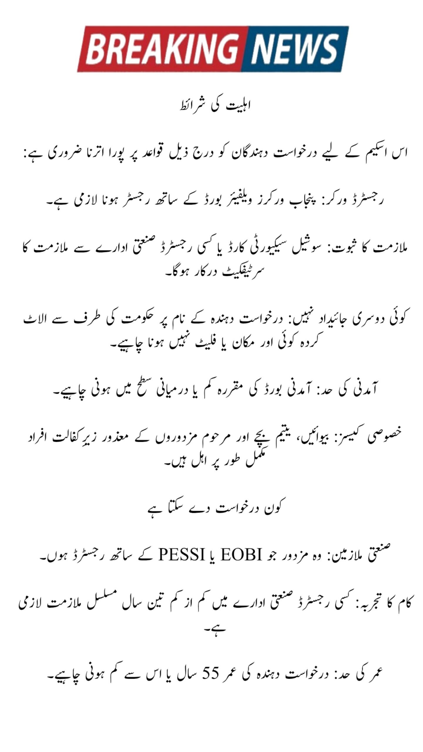 Registered Worker: Must be registered with the Punjab Workers Welfare Board.